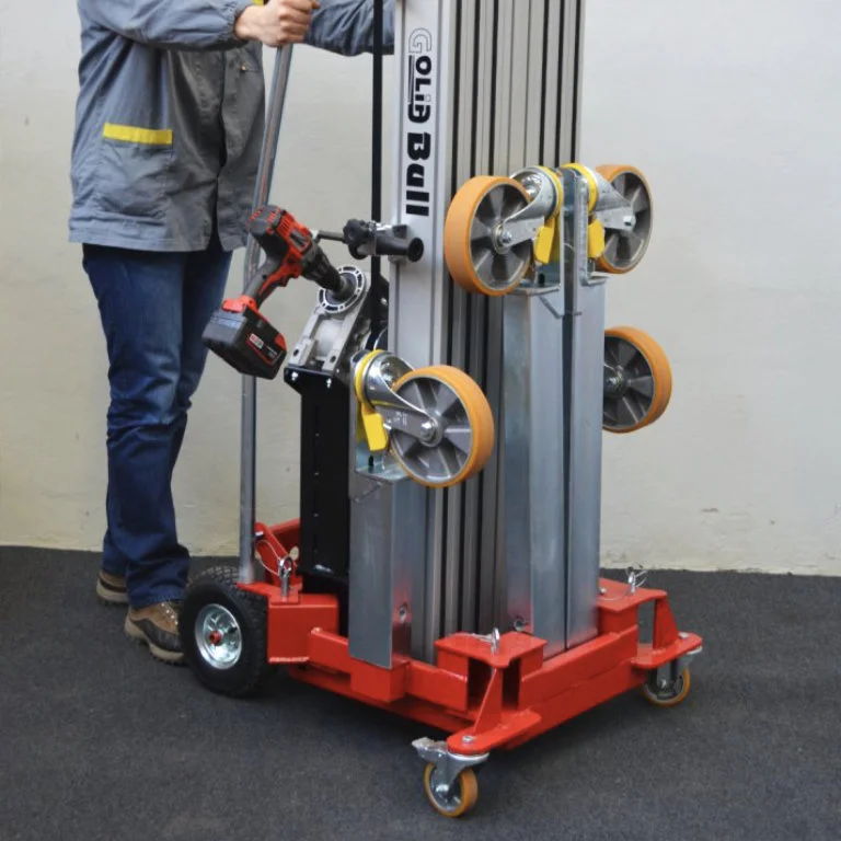 GOLIA BULL electric material lift. Aluminum frame, manual movement or using a drill-screwer. Max load 500 kg, Max height 3.9 mt. Equipped to lift glass panels. Vacuum glass lifter as option.