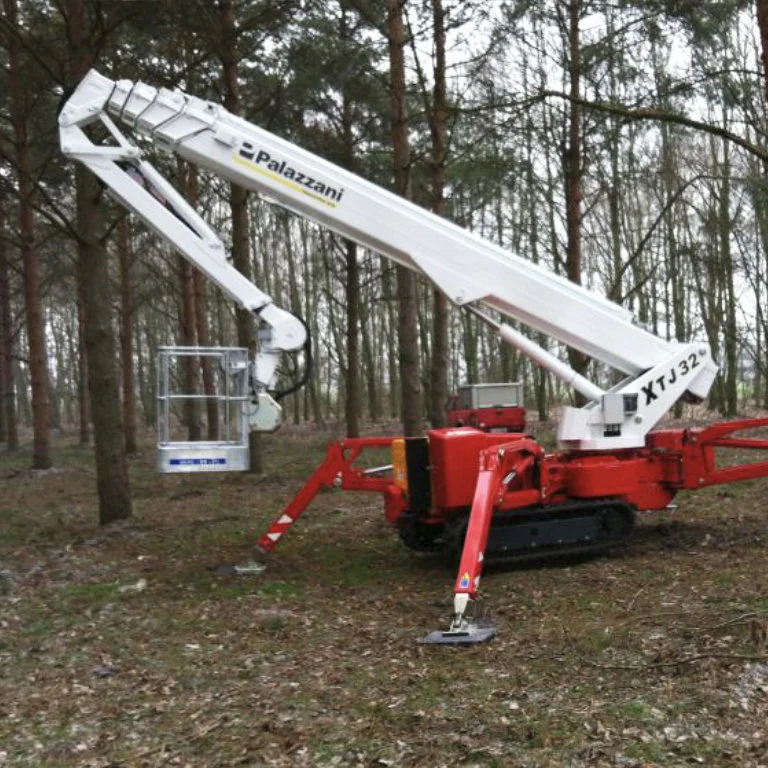 PALAZZANI XTJ 32 crawler spider lift with telescopic main boom and telescopic articulated jib. Equipped with Diesel Engine Hatz 2L41C and Electric motor. Max working height 32 mt, Max outreach 14,30 mt. Boom rotation 660°, Basket rotation 90°+80°. Battery and Hybrid version available.