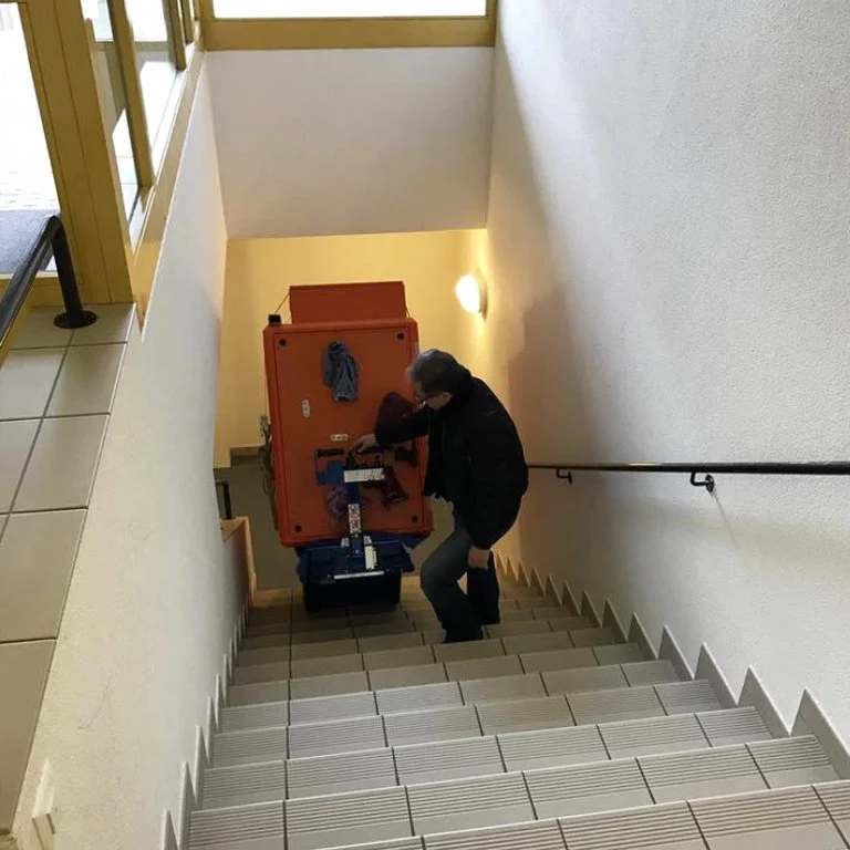 CTE PIANOPLAN 600J SPEEDY STANDARD battery-powered crawler stair climber. Suitable for the transport of all types of objects. Main features: protected handle and easily accessible functions, commands with proportional manipulator, reclining helm, hydraulic lift equipped with rollers, independent tracks for curvature, surmountable gradient of 45%.