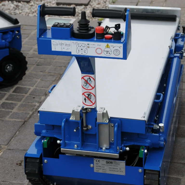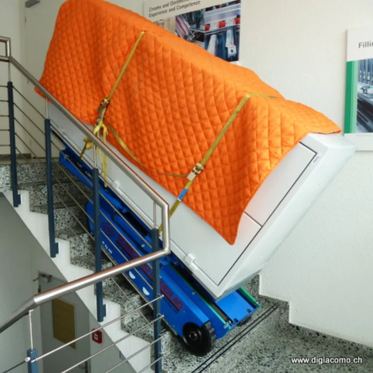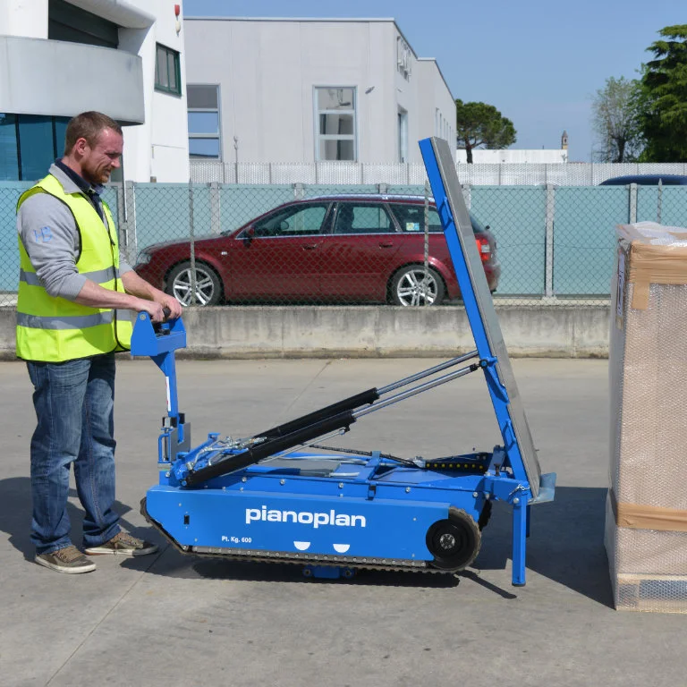 CTE PIANOPLAN 600J SPEEDY VERTICAL battery-powered crawler stair climber. VERTICAL model has been designed to facilitate anchoring, the loading and transport of certain types of material, or to facilitate their storage. For example, having to carry a bulky object with vertical development as a refrigerator, PIANOPLAN VERTICAL allows the anchor object in the vertical position and then the carriage in an inclined position. Thanks to the stabilisers, all the work is carried out in complete safety. Main features: same as Pianoplan Standard, plus a vertical platform to allow the anchoring of objects in vertical position, their transport and their storage returning them to the initial position.