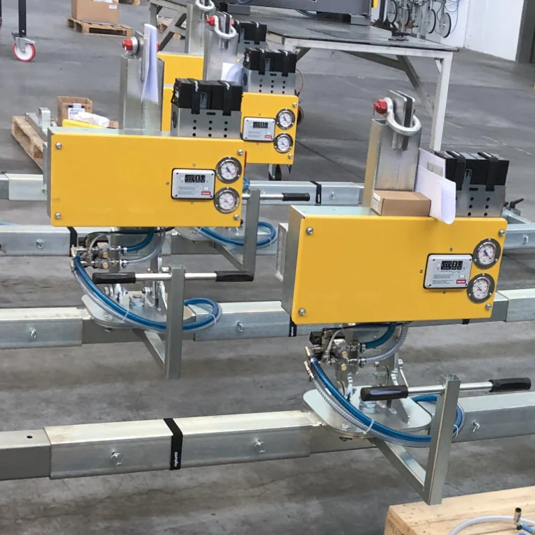 RIGHETTI CL1-6 battery powered cladding vacuum lifter. Max load 400 kg with 6 rectangular suction pads. Double vacuum circuit EN13155 standard. Manual 90° rotation. Manual 90° tilt. Modular frame. Radio remote as option.